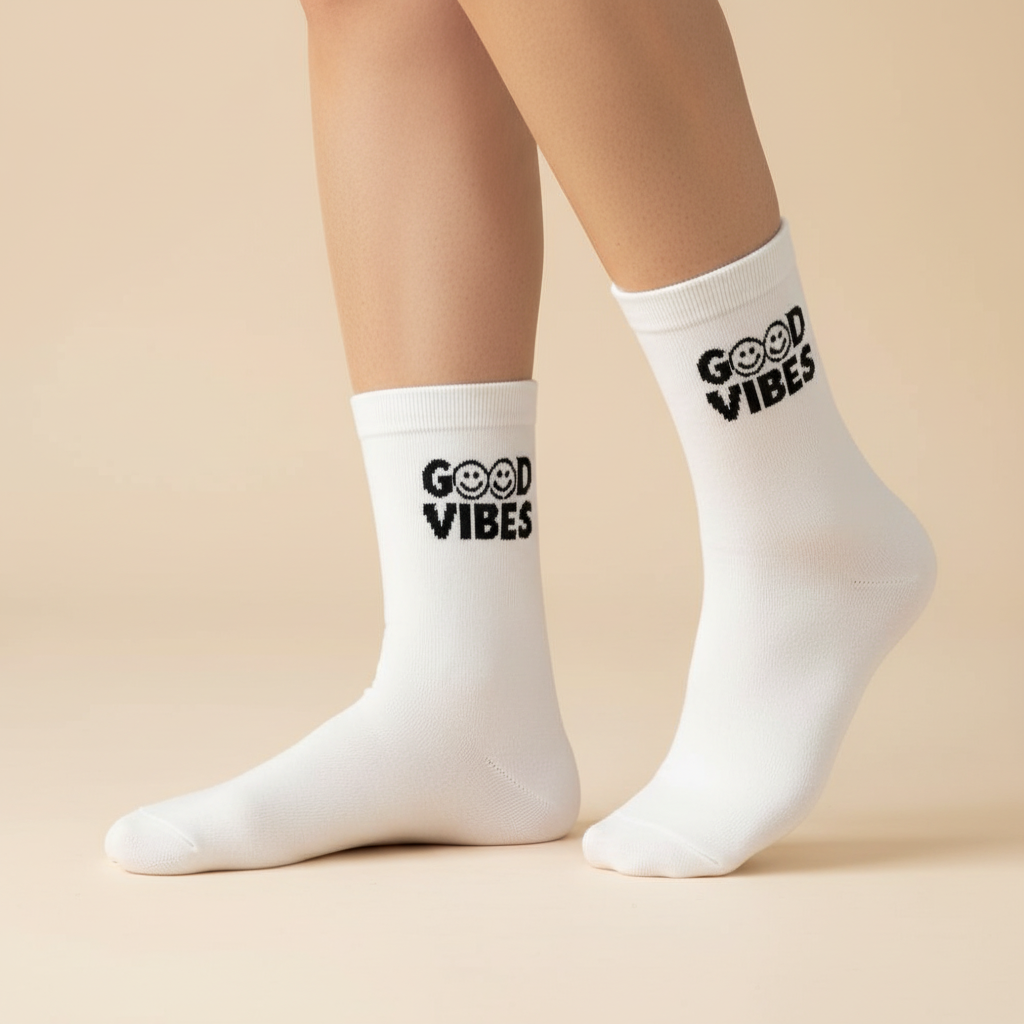 Diese weißen Socken überzeugen mit einem klaren, minimalistischen Design und einem markanten „GOOD VIBES“-Schriftzug im kontrastreichen Look. Das reduzierte Textmotiv verleiht dem Modell eine moderne, positive Ausstrahlung und macht es ideal für alle, die schlichte Socken mit Statement-Print suchen. Perfekt kombinierbar zu lässigen Alltags- und Freizeitoutfits.