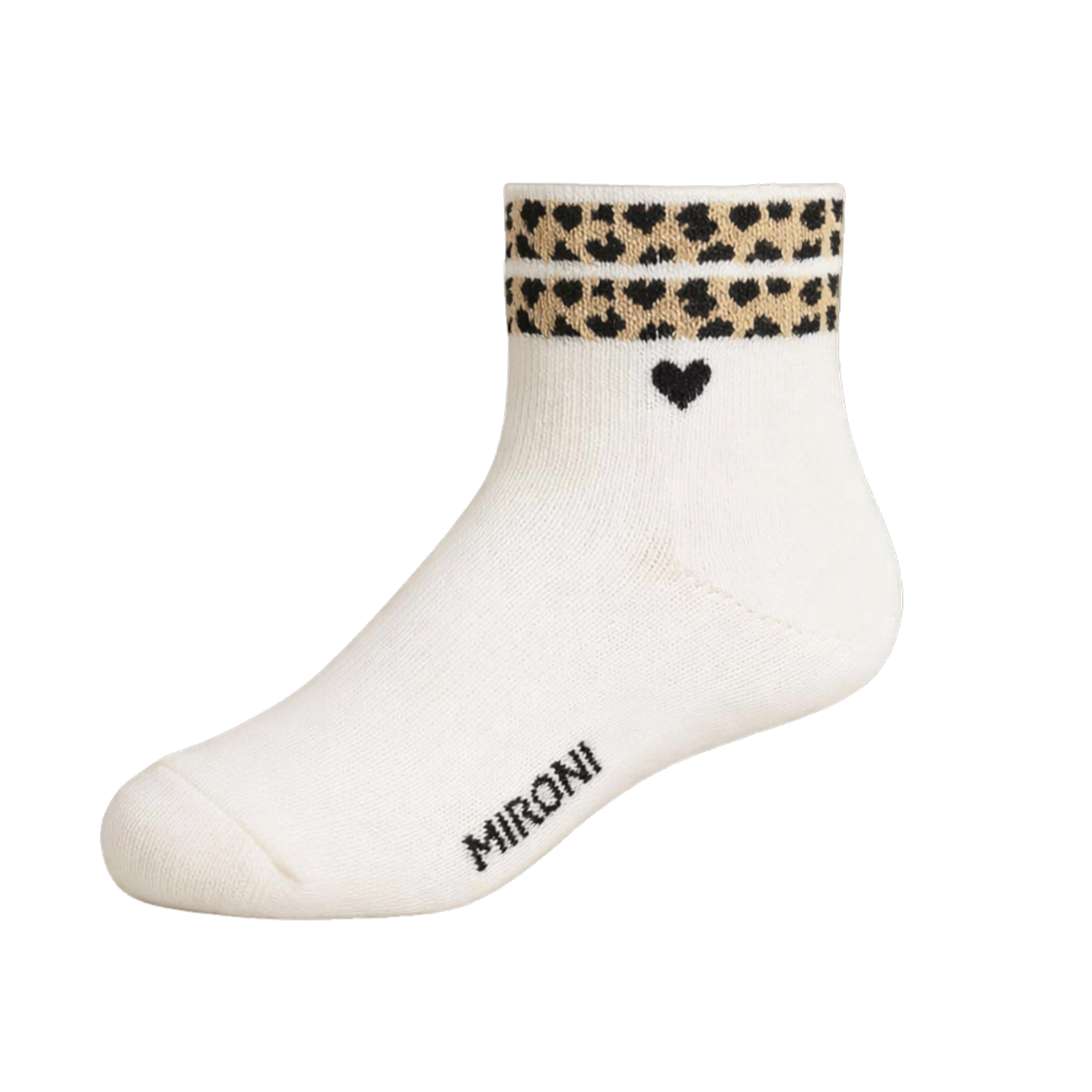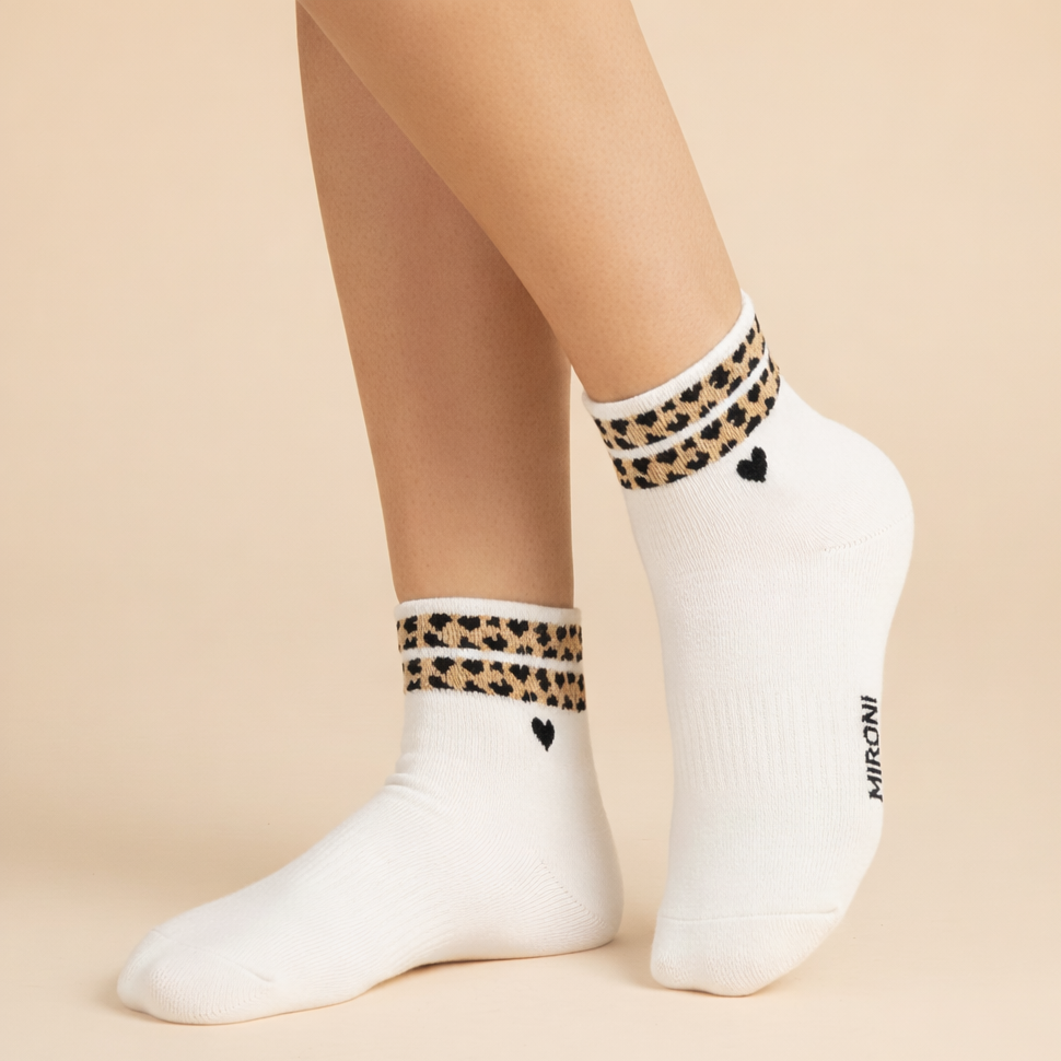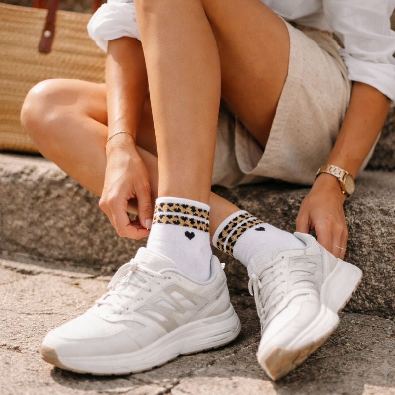 Diese weißen Quarter-Socken kombinieren ein markantes Leomuster-Bündchen mit einem kleinen Herzmotiv am Schaft. Der animalische Print setzt einen modischen Akzent, während das reduzierte Symbol für eine harmonische Balance sorgt. Ideal für alle, die Quarter-Socken mit Leomuster, Herzdetail und stylischem Look suchen.